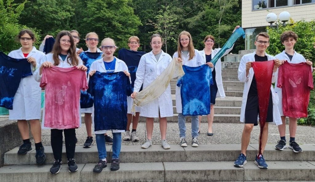 Zehn Schüler:innen haben sich in diesem Schuljahr am Färbeprojekt erstmalig aus den Klassen 7-9 beteiligt. Anders als erwartet, konnten nicht sofort ein Shirt oder Schal gefärbt werden, sondern die ersten drei Tage waren nur der Vorarbeit gewidmet.
